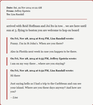档案显示,她自 2004 年经共同熟人介绍认识爱泼斯坦后,保持了将近十年的联系,往来邮件和电话多达数百次。2014 年,她甚至搭乘爱泼斯坦的私人飞机从加勒比海返回波士顿,邮件中轻松询问对方旅行近况,还讨论航班安排。那时已经是爱泼斯坦 2008 年定罪后的几年,这段往来也因此引发了媒体和公众质疑。